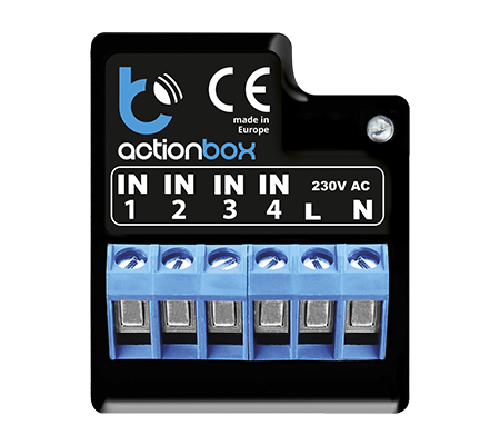 Wyzwalacz akcji actionBox to urządzenie zasilane 230 VAC. ActionBox steruje innymi urządzeniami BleBox. Mozna podłączyć do tego sterownika aż 4 przyciski (fizyczne lub wirtualne) do sterownaia innymi urządzeniami. ActionBox może wywołać aż 30 różnych scen.