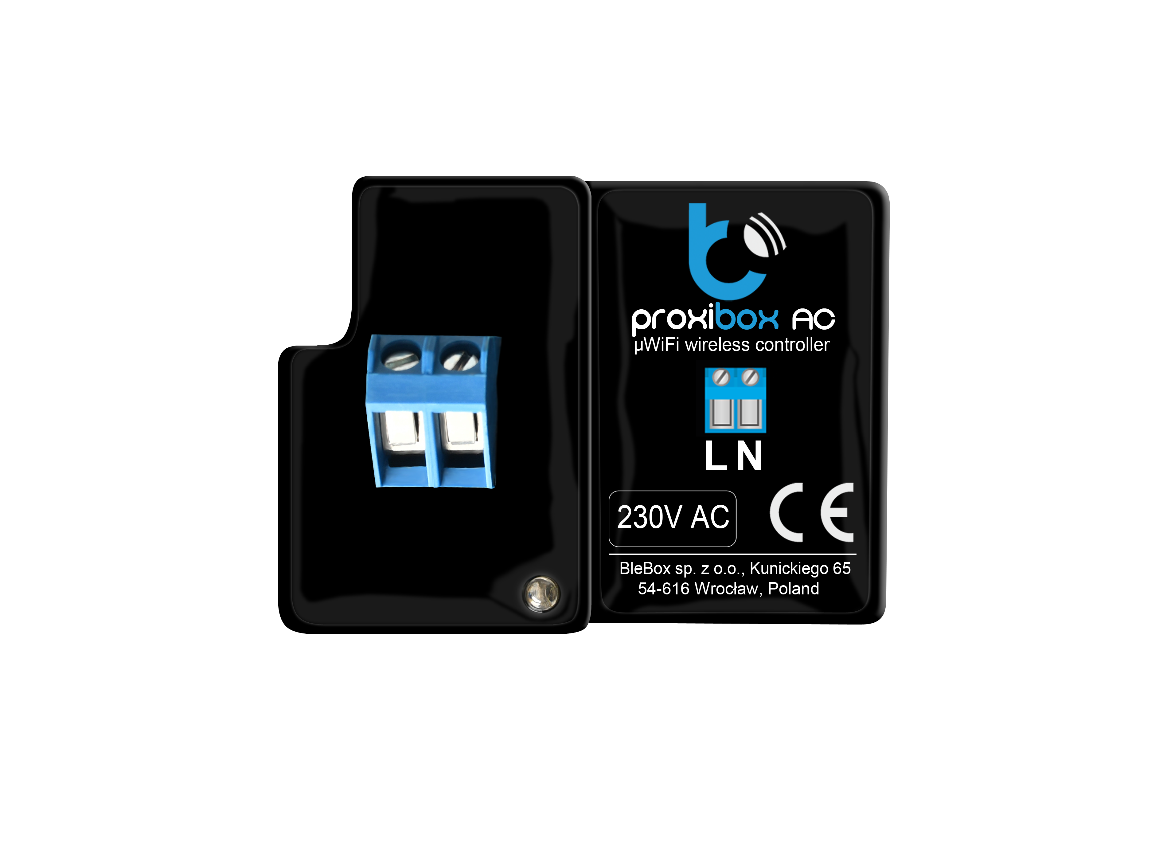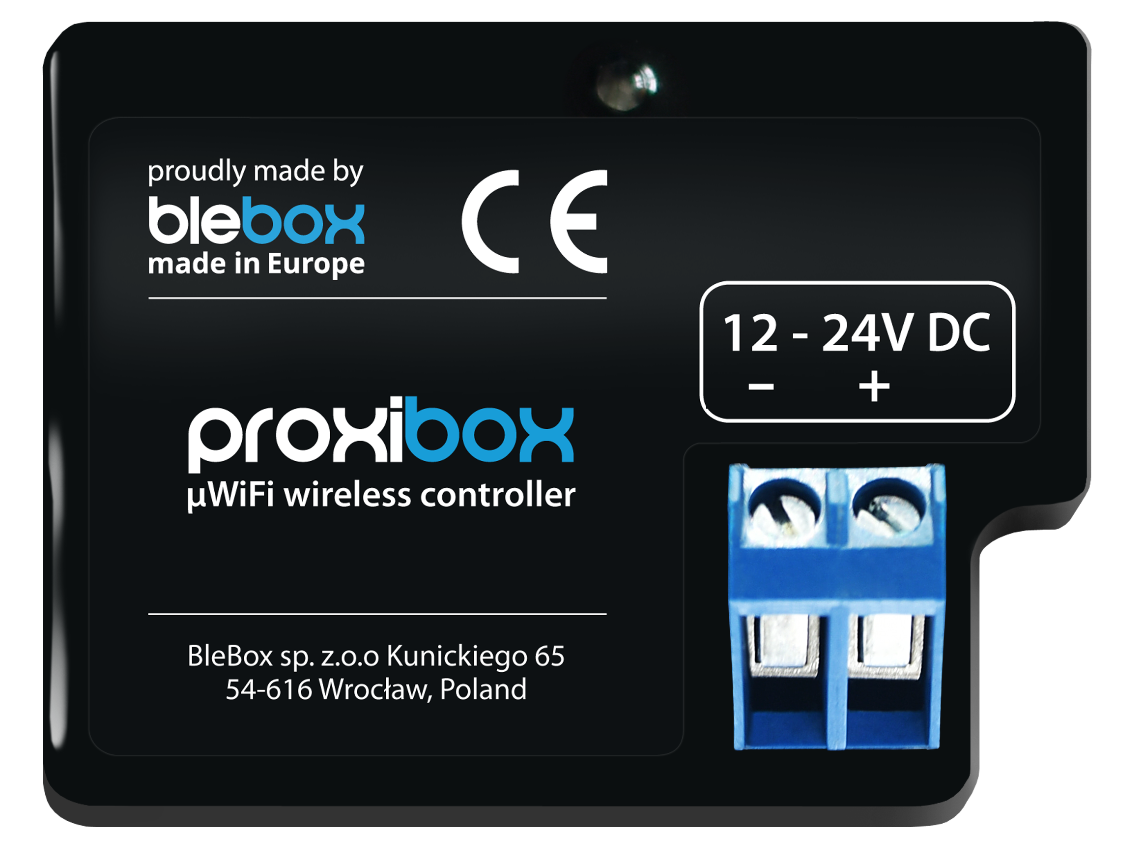 Sterownik proxiBox to urządzenie do zbliżeniowego sterowania innymi urządzeniami BleBox. Urządzenie można umieścić w niewidocznym miejscu, a sygnał zostanie wysłąny w momencie zbliżenia dłoni w pobliże sterownika. Urządzenie zasilane jest napięciem stałym 12-24 VDC.