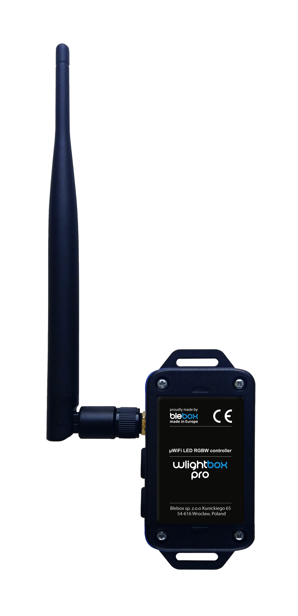 Sterownik wlightBox Pro to urządzenie pzeznaczone so montażu na zewnątrz sterujące oświetleniem 12-24 DC LED, LED RGBW, RGBW/CT. Urządzenie jest wodoodporne. Antena zewnętrzna zwiększa zasięg.